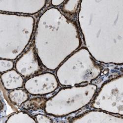 - Immunohistochemical staining of human thyroid gland shows strong positivity in glandular cells.