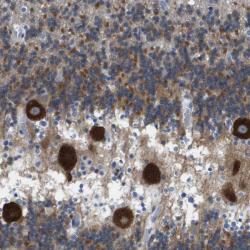 - Immunohistochemical staining of human cerebellum shows strong cytoplasmic positivity in purkinje cells.