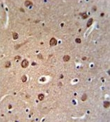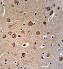 - Formalin fixed and paraffin embedded brain tissue reacted with FAM156A Antibody (C-term) Cat.-No AP51500PU-N followed by peroxidase conjugation of the secondary antibody and DAB staining.