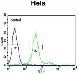- Flow cytometric analysis of Hela cells using FAM156A Antibody (C-term) Cat.-No AP51500PU-N (right histogram) compared to a negative control cell (left histogram). FITC-conjugated goat-anti-rabbit secondary antibodies were used for the analysis.