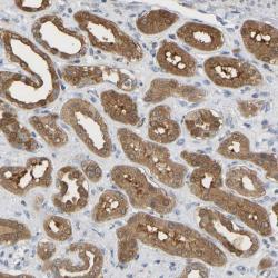 - Immunohistochemical staining of human kidney shows cytoplasmic positivity in cells of renal tubules.