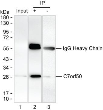 - Immunoprecipitation of C7orf50 in 200 µg of MCF7 lysate. Samples are as follows: Lane 1: MCF7 lysate, Lane 2: C7orf50 immunoprecipitated from MCF7 lysate, Lane3: The same as Lane 2 but KT82 was used as IgG isotype control antibody. After absorption with Protein G beads, the mixture was run on 6-18% SDS-PAGE, blotted onto nitrocellulose membrane, and peroxidase conjugated goat anti-mouse IgG (Fc specific) was used as the secondary antibody. The isotype control antibody was KT82. Incubation of samples with C7orf50 monoclonal antibody (Product # MA5-55965) at a dilution of 2.5 µg was used.