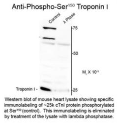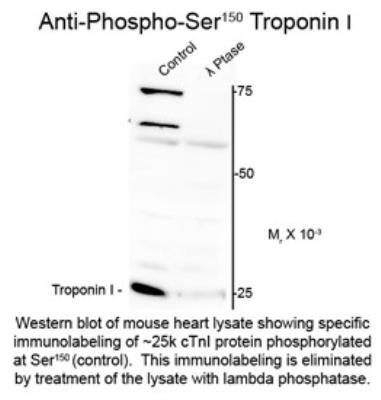 - Immunogen affinity purified. Specific for the ~25k cardiac troponin I protein phosphorylated at Ser150. Immunolabeling is greatly decreased with lambda-phosphatase treatment.