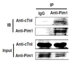 - Immunoprecipitation: Troponin I Type 3 (cardiac) [p Ser150] Antibody [NBP2-29526] - Adult mouse heart tissue samples were extracted and immunoprecipitated with either anti-Pim-1 antibody or control IgG and then analyzed by Western blot. From Zhu et al.: Phosphorylation of cTnI by Pim1 Kinase, Cell Physiol Biochem 2018;45:2174-2186.