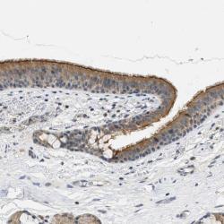 - Immunohistochemical staining of human bronchus shows moderate cytoplasmic positivity in respiratory epithelial cells. A strong membranous staining was also noted.