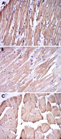 - Immunohistochemical analysis of paraffin-embedded human rabbit cardiac muscle tissue (A), cardiac muscle tissue (B) and striated muscle tissue (C) using TNNI2 monoclonal antobody, clone 2F12A11 (Cat # MAB10337) with DAB staining.