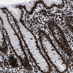 - Immunohistochemical staining of human appendix shows strong nuclear positivity in glandular cells.