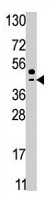 - Western blot analysis of SEPHS2 polyclonal antibody (Cat # PAB2041) in HepG2 cell line lysate (35 ug/lane). SEPHS2 (arrow) was detected using the purified Polyclonal antibody.