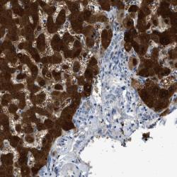 - Immunohistochemical staining of human liver shows strong positivity in hepatocytes.