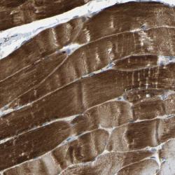 - Immunohistochemical staining of human skeletal muscle shows strong cytoplasmic positivity in myocytes.