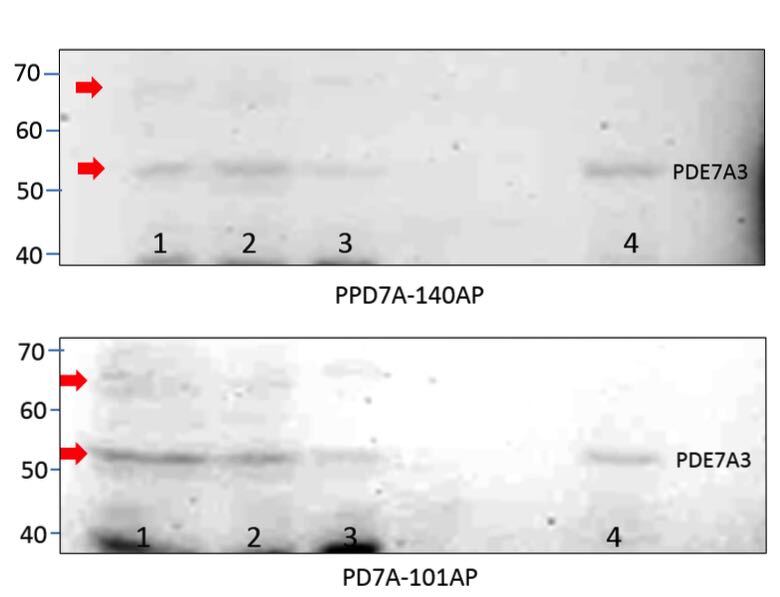 - WB of PDE7ZA antibody with SKNMBE (1), MCF7 (2), Hu (3) and rat testis (4). Upper panel blotted with Phospho-PDE7A (STJ502624) and lower panel PDE7A (STJ502365).