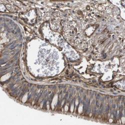 - Immunohistochemical staining of human bronchus shows cytoplasmic and basement membranous positivity in respiratory epithelial cells.