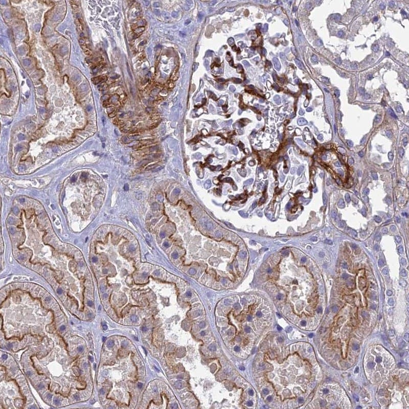 - Immunohistochemical analysis of Tensin 1 in human kidney using Tensin 1 Polyclonal Antibody (Product # PA5-57515) shows distinct membranous positivity in cells in tubules and cells in glomeruli.