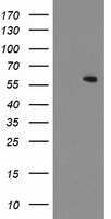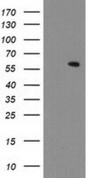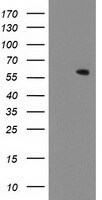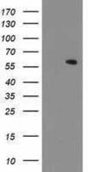 - HEK293T cells were transfected with the pCMV6-ENTRY control (Left lane) or pCMV6-ENTRY MKRN1 (RC206848, Right lane) cDNA for 48 hrs and lysed. Equivalent amounts of cell lysates (5 µg per lane) were separated by SDS-PAGE and immunoblotted with anti-MKRN1. Positive lysates LY415580 (100 µg) and LC415580 (20 µg) can be purchased separately from OriGene.