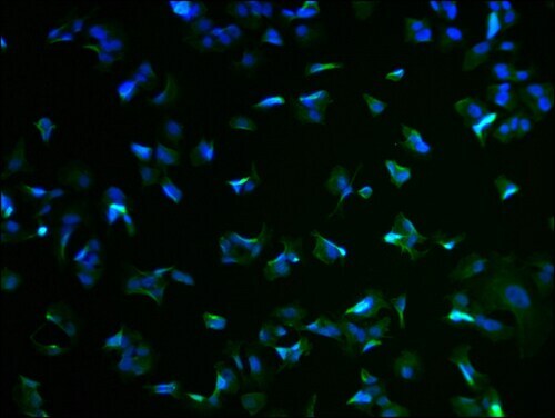 - Immunocytochemistry/Immunofluorescence analysis of RIM4 in MCF-7 cells using RIM4 Polyclonal Antibody (Product # PA5-121464) at 1:100, counter-stained with DAPI. The cells were fixed in 4% formaldehyde and blocked in 10% normal Goat Serum. The cells were then incubated with the antibody overnight at 4°C. The secondary antibody was Alexa Fluor 488-congugated AffiniPure Goat Anti-Rabbit IgG(H+L).