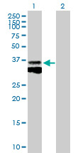 - Western Blot analysis of CTSB expression in transfected 293T cell line (H00001508-T01) by CTSB MaxPab polyclonal antibody.Lane 1: CTSB transfected lysate(37.29 KDa).Lane 2: Non-transfected lysate.