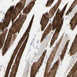 - Immunohistochemical staining of human skeletal muscle shows strong cytoplasmic positivity in myocytes.