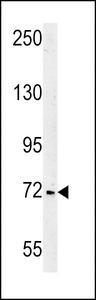 - SHCBP1 Antibody western blot of Jurkat cell line lysates (35 ug/lane). The SHCBP1 antibody detected the SHCBP1 protein (arrow).