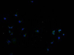 - Immunocytochemistry analysis of SH-SY5Y cells with SLC22A10 polyclonal antibody (Product # PA5-144375) at 1:100, counter-stained with DAPI. The cells were fixed in 4% formaldehyde and blocked in 10% normal Goat Serum. The cells were then incubated with the antibody overnight at 4°C. The secondary antibody was Alexa Fluor 488-congugated AffiniPure Goat Anti-Rabbit IgG (H+L).