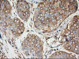 - Immunohistochemical staining of paraffin-embedded Adenocarcinoma of Human breast tissue using anti-TUBB4 mouse monoclonal antibody. (Heat-induced epitope retrieval by 10mM citric buffer, pH6.0, 100°C for 10min, TA503086)
