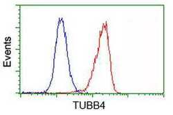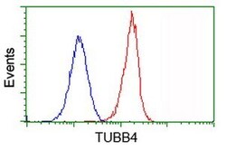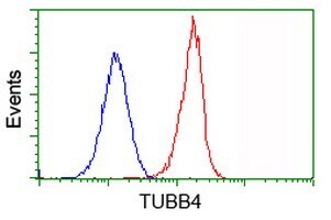 - Flow cytometric analysis of Hela cells, using anti-TUBB4 antibody (TA503086), (Red), compared to a nonspecific negative control antibody, (Blue).
