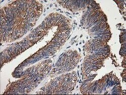 - Immunohistochemical staining of paraffin-embedded Adenocarcinoma of Human endometrium tissue using anti-TUBB4 mouse monoclonal antibody. (Heat-induced epitope retrieval by 10mM citric buffer, pH6.0, 100°C for 10min, TA503086)