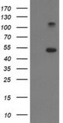 - HEK293T cells were transfected with the pCMV6-ENTRY control (Left lane) or pCMV6-ENTRY TUBB4 (RC203945, Right lane) cDNA for 48 hrs and lysed. Equivalent amounts of cell lysates (5 µg per lane) were separated by SDS-PAGE and immunoblotted with anti-TUBB4. Positive lysates LY401833 (100 µg) and LC401833 (20 µg) can be purchased separately from OriGene.