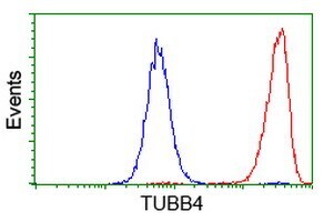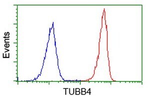 - Flow cytometric analysis of Hela cells, using anti-TUBB4 antibody (TA503110), (Red), compared to a nonspecific negative control antibody (TA50011), (Blue).