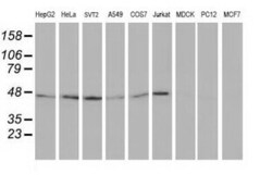 - Western blot analysis of extracts (35 µg) from 9 different cell lines by using anti-TUBB4 monoclonal antibody.