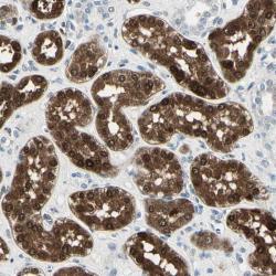 - Immunohistochemical staining of human kidney shows strong cytoplasmic and nuclear positivity in cells of tubules.