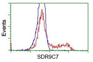 - HEK293T cells transfected with either RC210941 overexpress plasmid (Red) or empty vector control plasmid (Blue) were immunostained by anti-SDR9C7 antibody (TA501690), and then analyzed by flow cytometry.