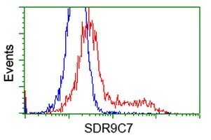 - HEK293T cells transfected with either RC210941 overexpress plasmid (Red) or empty vector control plasmid (Blue) were immunostained by anti-SDR9C7 antibody (TA501733), and then analyzed by flow cytometry.