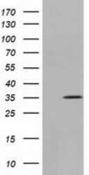 - HEK293T cells were transfected with the pCMV6-ENTRY control (Left lane) or pCMV6-ENTRY SDR9C7 (RC210941, Right lane) cDNA for 48 hrs and lysed. Equivalent amounts of cell lysates (5 µg per lane) were separated by SDS-PAGE and immunoblotted with anti-SDR9C. Positive lysates LY407754 (100 µg) and LC407754 (20 µg) can be purchased separately from OriGene.