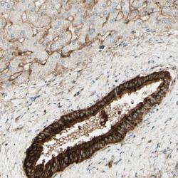 - Immunohistochemical staining of human liver shows strong cytoplasmic positivity in bile duct cells.