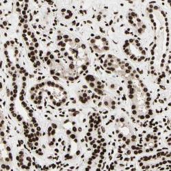 - Immunohistochemical staining of human kidney shows strong nuclear positivity in cells of tubules.