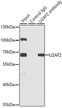 - Immunoprecipitation analysis of U2AF2 was performed in 200 µg extracts of SW620 cells using U2AF2 Polyclonal Antibody (Product # PA5-95999). Western blot was performed from the immunoprecipitate using U2AF2 Polyclonal Antibody.