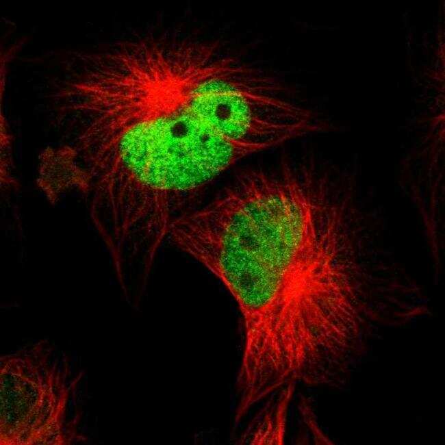 - Immunofluorecent analysis of WDHD1 in human cell line U-251 MG using WDHD1 Polyclonal Antibody (Product # PA5-51517). Staining shows localization to nucleoplasm.