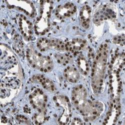 - Immunohistochemical staining of human kidney shows strong nuclear positivity in cells of tubules.