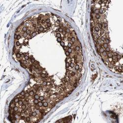- Immunohistochemical staining of human testis shows strong cytoplasmic positivity in cells of seminiferus ducts.