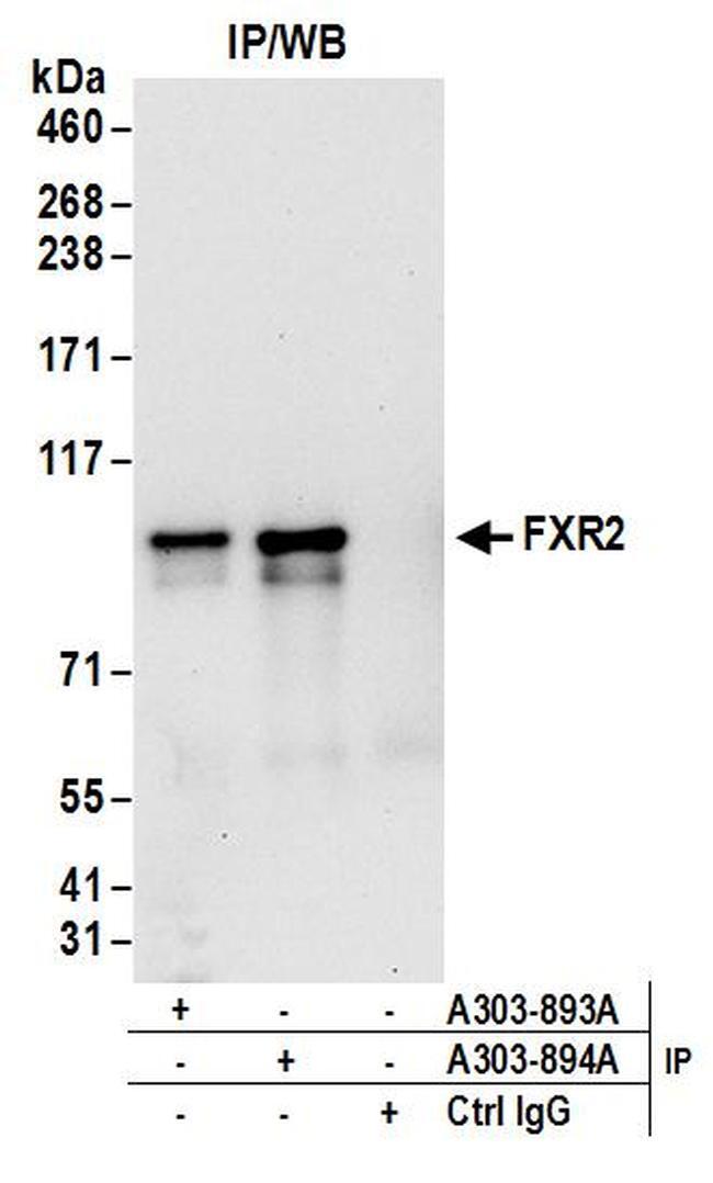 - Detection of human FXR2 by western blot of immunoprecipitates. Samples: Whole cell lysate (1 mg for IP; 20% of IP loaded) from 293T cells. Antibodies: Affinity purified rabbit anti-FXR2 antibody A303-893A (lot A303-893A-1) used for IP at 6 µg/mg lysate. FXR2 was also immunoprecipitated by rabbit anti-FXR2 antibody A303-894A. For blotting immunoprecipitated FXR2, A303-893A was used at 1 µg/ml. Detection: Chemiluminescence with an exposure time of 30 seconds.