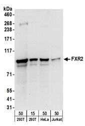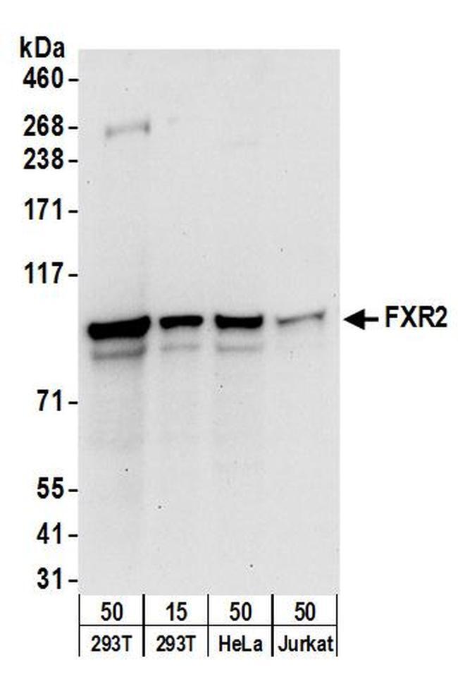 - Detection of human FXR2 by western blot. Samples: Whole cell lysate from 293T (15 and 50 µg), HeLa (50µg), and Jurkat (50µg) cells. Antibodies: Affinity purified rabbit anti-FXR2 antibody A303-893A (lot A303-893A-1) used for WB at 0.1 µg/ml. Detection: Chemiluminescence with an exposure time of 30 seconds.