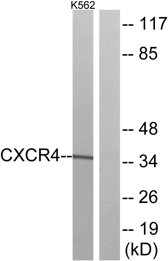 - Western blot analysis of lysates from K562 cells, using CXCR4 Antibody. The lane on the right is blocked with the synthesized peptide.