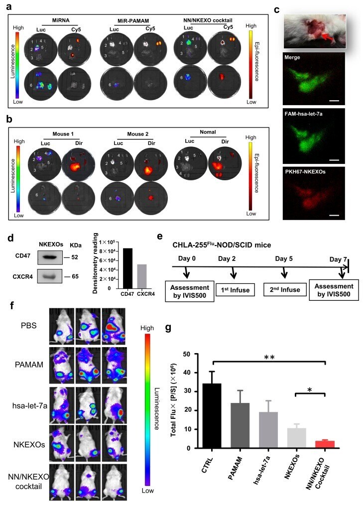 - Figure 4 In vivo biodistribution and anti-tumor effect of the NN/NKEXO cocktail. ( a ) Bioluminescence (Luc) and miRNA fluorescence (Cy5) images of major organs of the NOD/SCID mice bearing systemic CHLA-255-luc tumors 6 h after intravenous (i.v.) injection of Cy5-let-7a, Cy5-let-7a-dendrimers and Cy5-labeled NN/NKEXO cocktail: 1) Heart; 2) lung; 3) liver; 4) kidney; 5) spleen and 6) tumor. ( b ) Bioluminescence (Luc) and fluorescence images of major organs 6 h after i.v. injection of DiR-labeled NN/NKEXO cocktail made of 5.28 µg of let-7a and 100 mug of NKEXOs. ( c ) In vivo two-photon excitation fluorescence images of the CHLA-255 luc subcutaneous tumor model 20 min after i.v. injection of 400 muL dual fluorescently labeled NN/NKEXO cocktail made of 5.28 µg of let-7a and 100 mug of NKEXOs. ( d ) Expression of functional proteins (CD47 and CXCR4) was confirmed by WB. ( e ) Experimental protocol for CHLA-255 luc -NOD/SCID mice shown in ( f ). ( f ) Bioluminescence imaging (BLI) performed in CHLA-255 luc -NOD/SCID mice treated with different cocktail formulations at let-7a dose of 5.28 µg and NKEXO dose of 100 µg ( n = 3). ( g ) Quantification of BLI results. Each bar represents mean +- SD of three replicates. * p < 0.05 and ** p < 0.001.