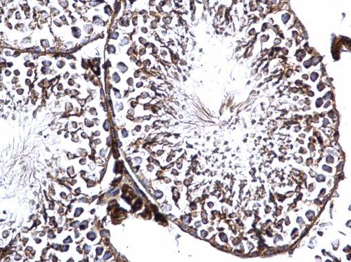 - GFM2 antibody detects GFM2 protein at cytosol on mouse testis by immunohistochemical analysis. Sample: Paraffin-embedded mouse testis. GFM2 antibody (GTX124071) dilution: 1:1000.