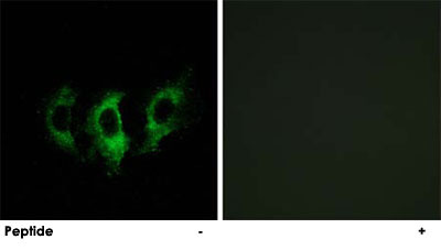 - Immunofluorescence analysis of A-549 cells, using GFM2 polyclonal antibody (Cat # PAB17710).Peptide "+" means "with peptide blocking".