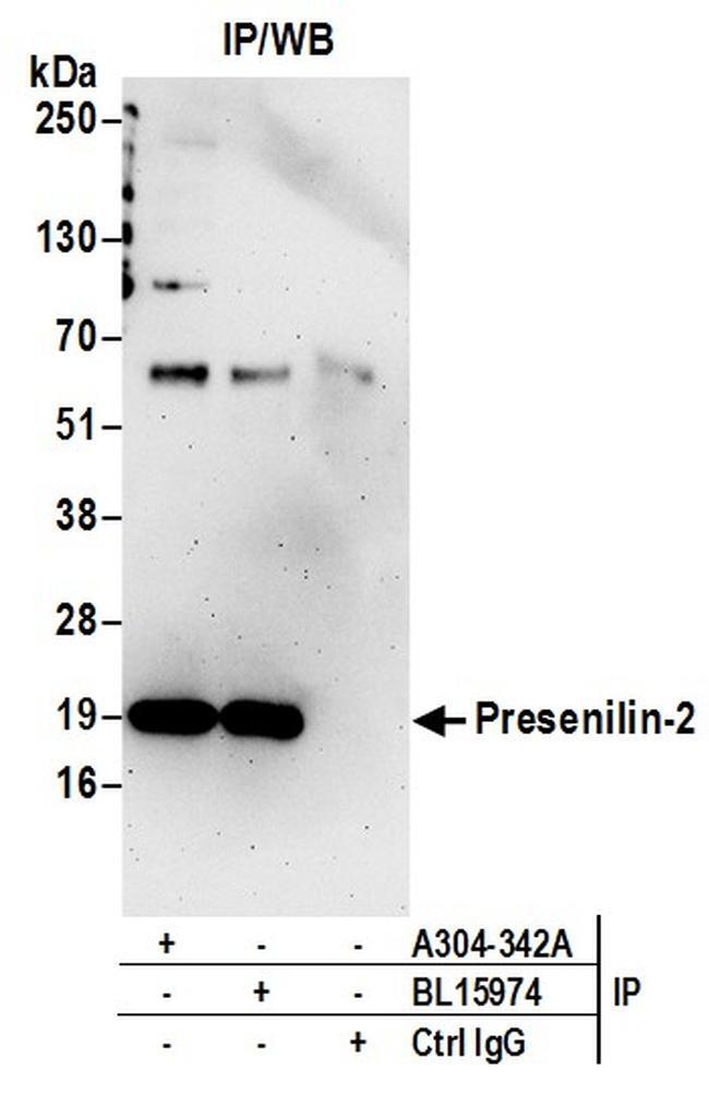 - Detection of human Presenilin-2 by western blot of immunoprecipitates. Samples: Whole cell lysate (0.5 or 1.0 mg per IP reaction; 20% of IP loaded) from 293T cells. Antibodies: Affinity purified rabbit anti-Presenilin-2 antibody A304-342A (lot A304-342A-1) used for IP at 6 µg per reaction. Presenilin-2 was also immunoprecipitated by rabbit anti-Presenilin-2 antibody BL15974. For blotting immunoprecipitated Presenilin-2, A304-342A was used at 1 µg/ml. Detection: Chemiluminescence with an exposure time of 3 minutes.