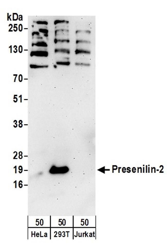 - Detection of human Presenilin-2 by western blot. Samples: Whole cell lysate (50 µg) from HeLa, 293T, and Jurkat cells. Antibodies: Affinity purified rabbit anti-Presenilin-2 antibody A304-342A (lot A304-342A-1) used for WB at 0.4 µg/ml. Detection: Chemiluminescence with an exposure time of 3 minutes.