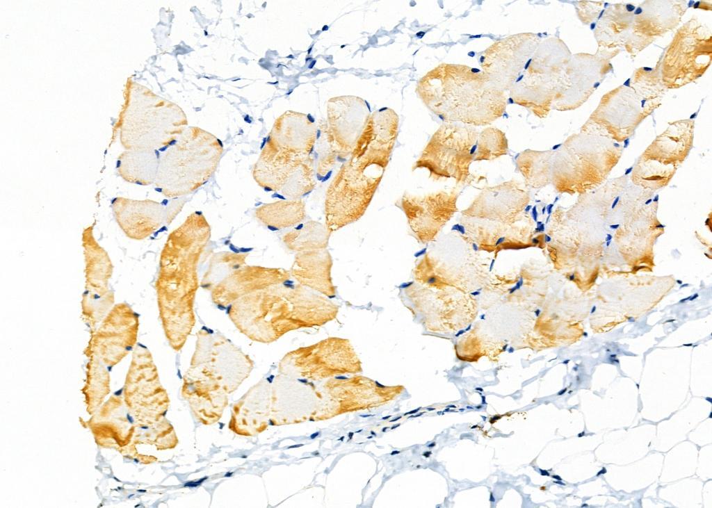 - Immunohistochemistry analysis of KCNK7 in rat muscle tissue. The sample was formaldehyde fixed and a heat mediated antigen retrieval step in citrate buffer was performed. Samples were incubated with KCNK7 polyclonal antibody (Product # PA5-106703) using a dilution of 1:100 (4°C overnight) followed by HRP conjugated anti-Rabbit secondary antibody.