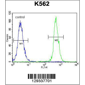 - NUDT19 Antibody (Center) (Cat. #OAAB07740) flow cytometric analysis of K562 cells (right histogram) compared to a negative control cell (left histogram).FITC-conjugated goat-anti-rabbit secondary antibodies were used for the analysis.
