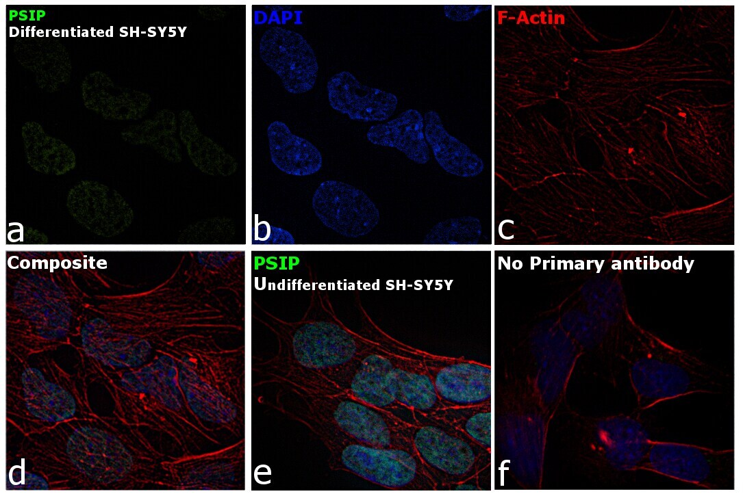 - Immunofluorescence analysis of PSIP was performed using SH-SY5Y and differentiated SH-SY5Y cells (Retinoic acid 10 uM, 8 Days). The cells were fixed with 4% paraformaldehyde for 10 minutes, permeabilized with 0.1% Triton™ X-100 for 10 minutes, and blocked with 1% BSA for 1 hour at room temperature. The cells were labeled with PSIP Rabbit Monoclonal Antibody (E.493.5) (Product # MA5-14821) at 1:250 dilution in 0.1% BSA and incubated overnight at 4 degree and then labeled with Goat anti-Rabbit IgG (H+L) Superclonal™ Secondary Antibody, Alexa Fluor® 488 conjugate (Product # A27034) at a dilution of 1:2000 for 45 minutes at room temperature (Panel a: green). Nuclei (Panel b: blue) were stained with SlowFade® Gold Antifade Mountant with DAPI (Product # S36938). F-actin (Panel c: red) was stained with Rhodamine Phalloidin (Product # R415, 1:300). Panel d and e represents the merged image showing nuclear localization. Differentiated SH-SY5Y cells show lower levels of PSIP (Panel d) as compared to undifferentiated SH-SY5Y cells (Panel e). Panel f represents control cells with no primary antibody to assess background. The images were captured at 60X magnification. .